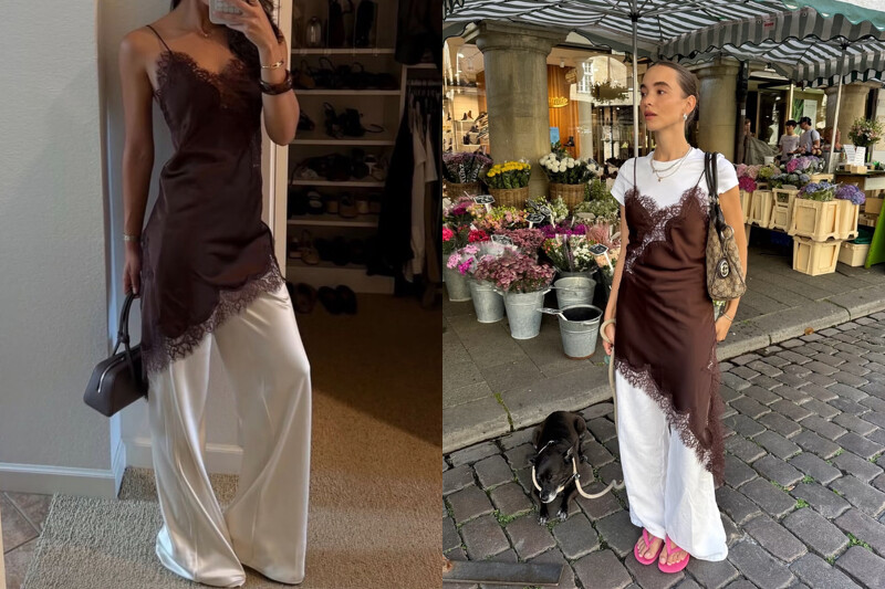 緞光洋裝加入蕾絲滾邊,是女孩們最喜歡的睡衣款式,既舒服又有女人味,不過要直接外穿還是讓你有點害羞嗎?剛開始嘗試的你,推薦可以搭配長褲來完成造型,垂墜感重的褲裝或是牛仔褲都很適合,以俐落中性的單品來中和溫柔的氛圍,如果還是不自在,也能夠多加一件T恤作為內搭。