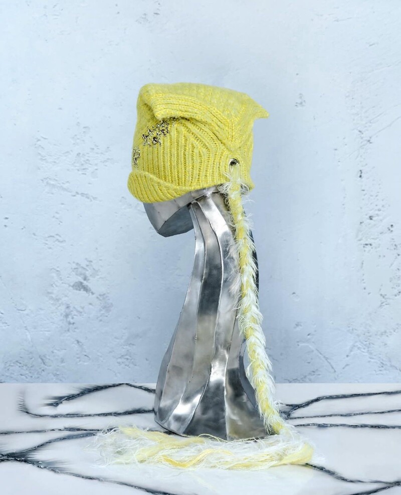 Felix戴上的藍色款式Yoda Beanie,有著可愛的小垂耳輪廓,前方點綴大小不一的金屬、水鑽珠飾,後方則垂掛一條長編織毛線,在ATiiSSU的設計中,算是日常好搭配又有不乏搶眼特色的一款,同時此款也獲得韓妞們的喜愛,更是編輯本次新系列當中的私心TOP1。