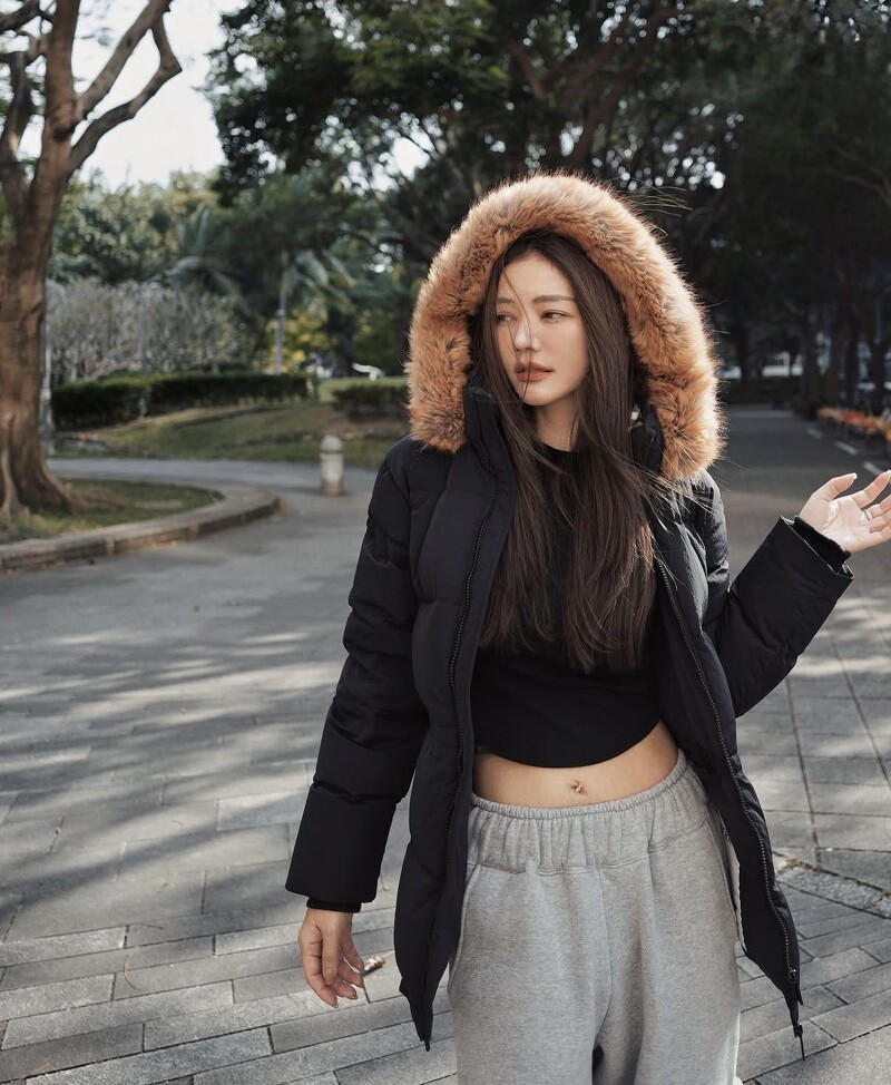 黑色羽絨外套搭配短版內搭,露出一小段腰線,整體氣場立刻轉為年輕而有自信。青春儲值點:不必從頭到腳地性感,厲害的方法就是只要留一個「破口」,就能瞬間讓厚重輪廓變得有活力以及記憶點唷。