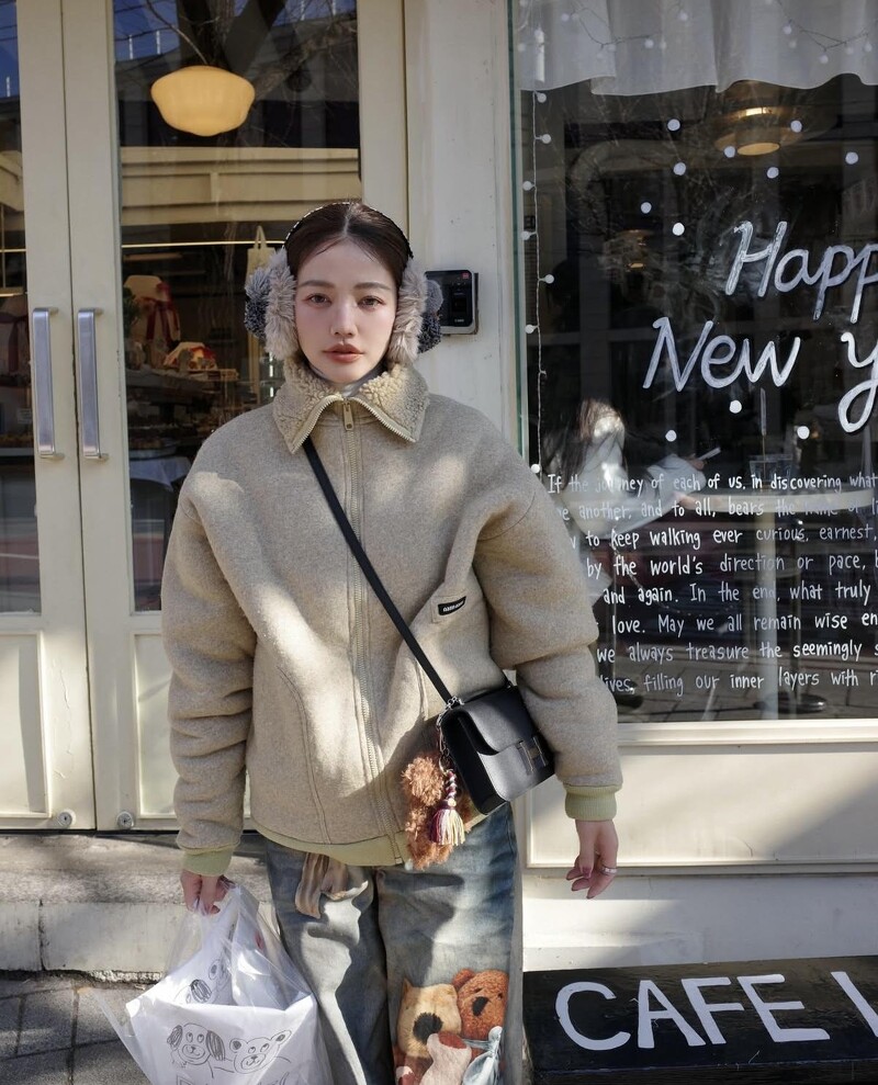 奶油色羊羔外套搭配毛茸茸耳罩是不是可愛的讓人融化?而且讓許路兒整體輪廓溫柔而圓潤?他利用耳罩直接框住臉型,柔化五官線條,讓原本偏成熟的大地色外套瞬間多了一層「少女感」。青春儲值點: 年輕感集中在「臉部周圍」,即便羔羊刷毛的外套領子稍微遮蔽了脖子的線條,但表情與輪廓被柔軟材質包圍,就會自然顯得輕盈。