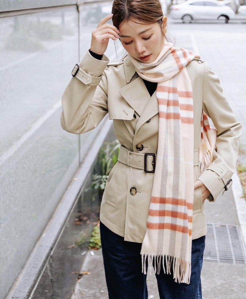 這套Burberry的深色絎縫外套與格紋裙同樣偏向成熟路線,但許路兒卻用一條毛毛大尺寸圍巾,把整體拉回減齡的路上。圍巾半掩口鼻,畫面瞬間多了一層親密濾鏡、女友視角。青春儲值點: 大面積圍巾除了非常保暖,也能創造「微距感」,讓人想靠近,氣質時髦又年輕。