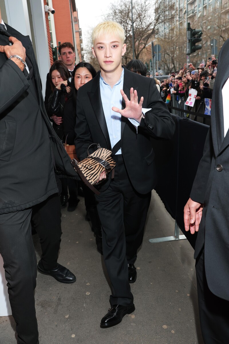 方燦頂著金髮小平頭來到Fendi大秀現場,挺拔的黑色西裝Look讓這天的他霸氣外露,手中的動物紋手袋則展現大膽的一面。