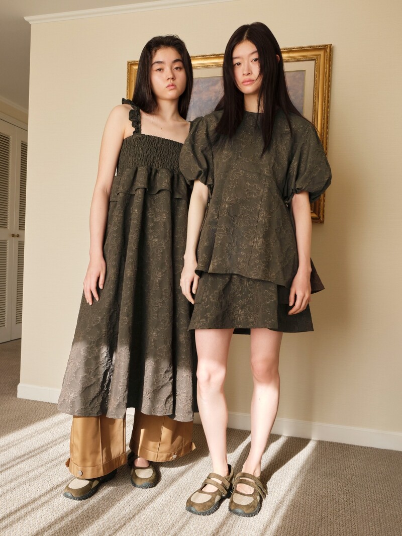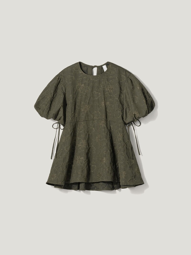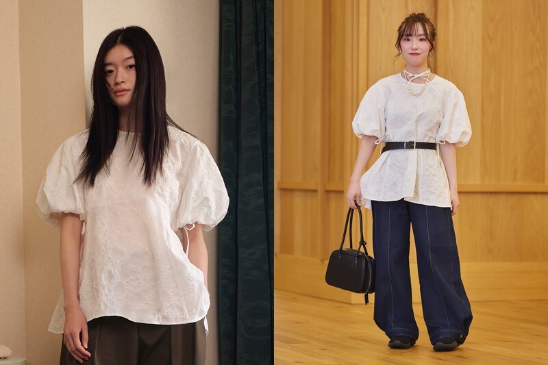 公主風的氣球袖上衣運用寬鬆剪裁削弱矜持感、增添活力,同時藉由立體輪廓能接納更多的身形體態,而看似簡約的外型,實則布滿了花朵緹花,以及鬆緊蝴蝶結裝飾於袖口、後背。不論與成套的下身搭配出完整的少女風格,或是與工裝寬褲、腰帶混搭出街頭風味,都相當適合!