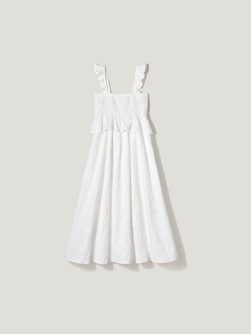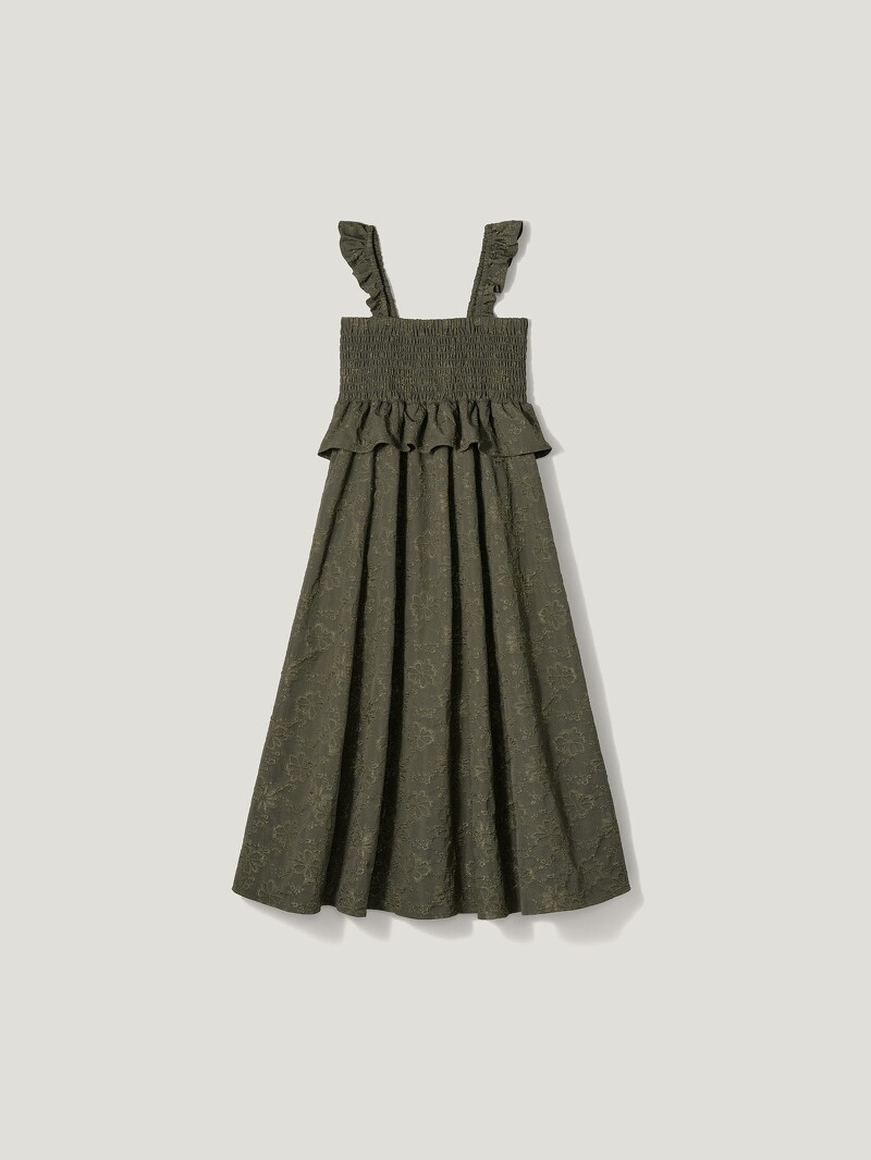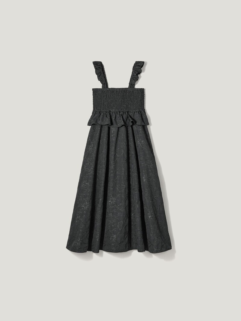 GU x ROKH本季大量運用了立體緹花布料,當中這件縮褶平口的連身裙,最能體現夏日的輕盈感了!肩帶上的荷葉邊設計是編輯最愛的小細節,不只可愛加分,還能提供滿滿的穩定性安全感,內搭任何單品也更有層次。