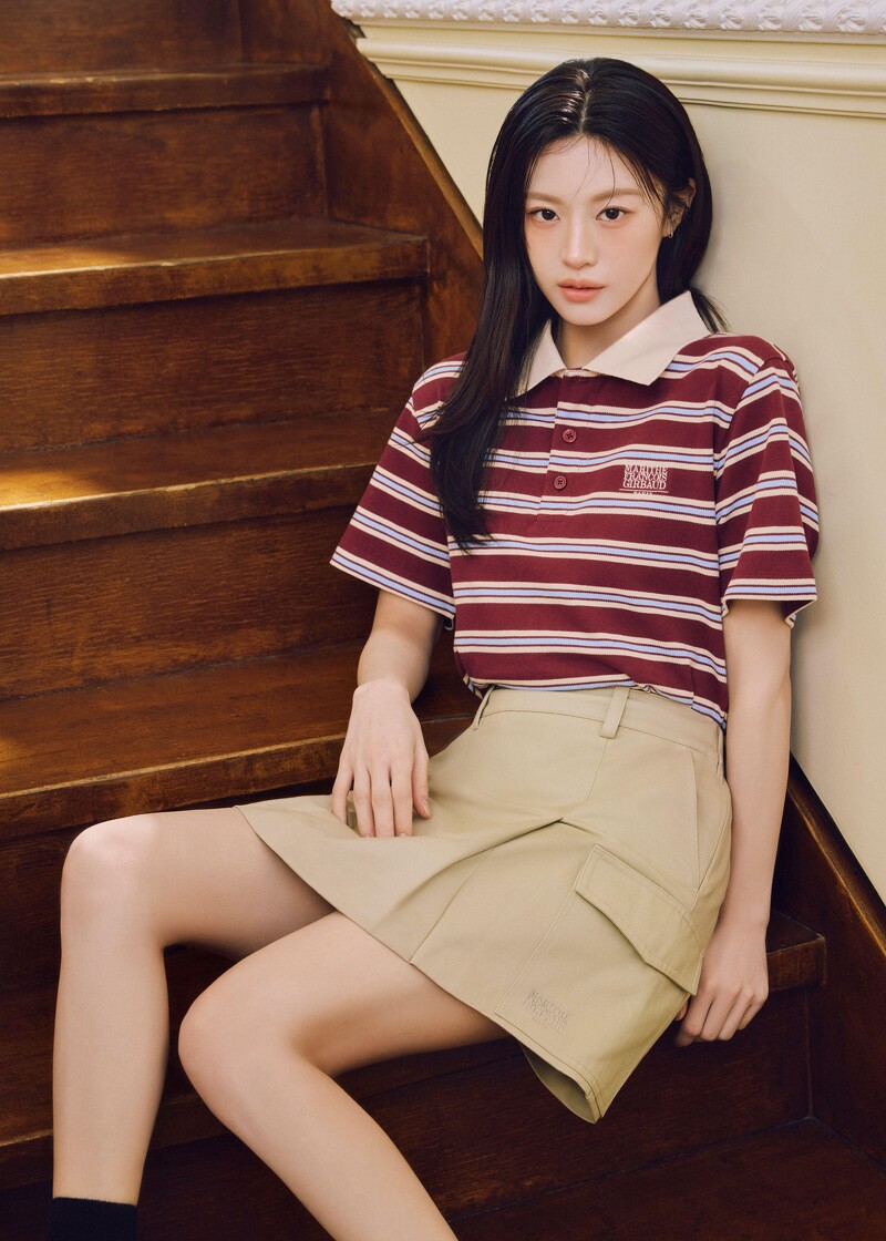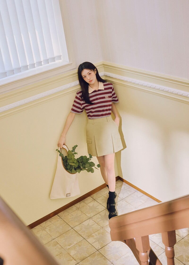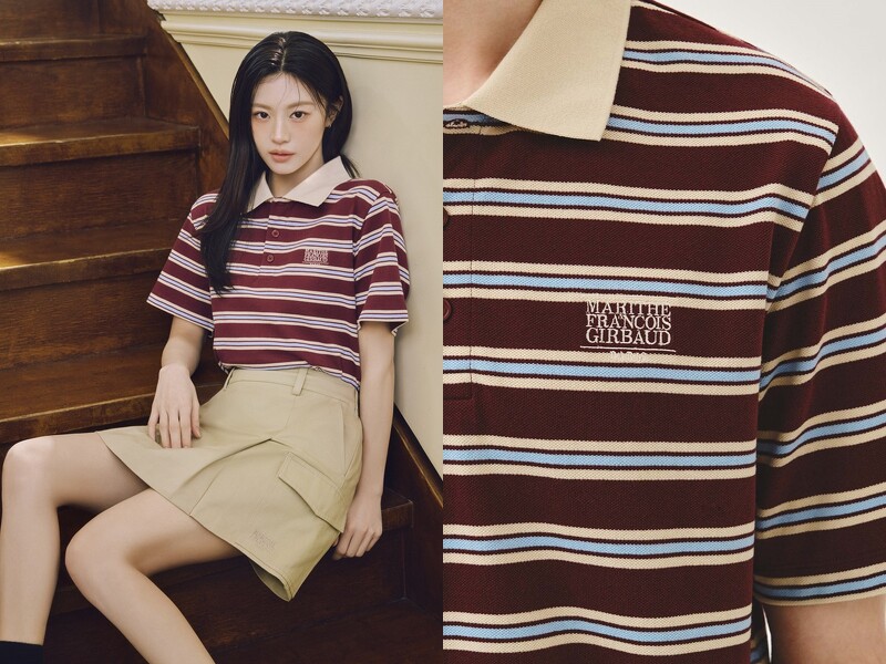 中性的Polo衫版型是男女皆能嘗試的風格,除了基本素面之外,更推薦大家可以嘗試高允貞同款條紋圓領衫,以深棕基底點綴淺藍線條,並有撞色衣領設計,替復古單品改良出現代俏皮感,再搭配上短裙,這套高允貞穿搭公式請筆記。