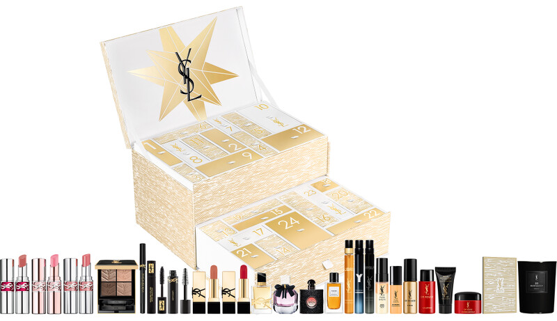 聖誕倒數月曆內容清單:YSL時尚4色眼影盤#100(正貨)、情挑誘光潤唇膏#1B(正貨)、情挑誘吻晶亮蜜唇膏#15(正貨)、情挑誘光水唇膏#44(正貨)、Y淡香精10ML、MYSLF淡香精10ML、自由不羈淡香精馥郁版10ML、自由不羈淡香精7.5ML、時尚訂製香水 煙管褲裝7.5ML、慾望巴黎淡香精7.5ML、黑鴉片淡香精7.5ML、LASH CLASH睫毛膏迷你版、奢華款3D耀黑睫毛膏迷你版、叛逆時尚防水眼線筆#01、奢華緞面唇膏迷你版#MN、奢華緞面唇膏迷你版#RM、金緻奢華賦活精華液7ML、金緻奢華賦活喚顏露10ML、金緻奢華賦活乳霜經典版7ML、極效活萃夜光仙 人掌超級精華7ML、極效活萃仙人掌眼部精華乳5ML、名模肌密光燦水凝露5ML、迷你時尚訂製香氛蠟燭、2025聖誕限量美妝鏡。