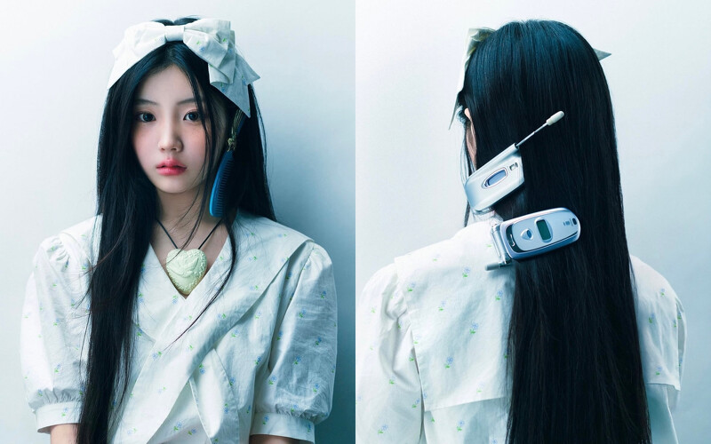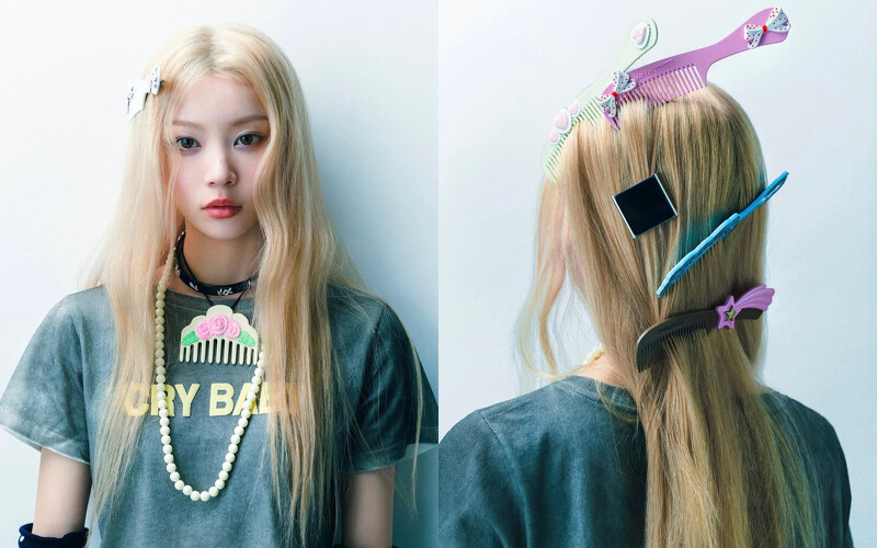 在概念照中,ILLIT成員們頭上的同款髮夾是來自倫敦品牌 Ashley Williams。品牌以千禧世代的視角出發,將肥皂、梳子等等日常用品重新轉化為前衛又帶幽默感的飾品 ,這種又怪又可愛的作品成功打破大眾對首飾的既定想像,也讓全球「酷女孩」為之著迷,再次點燃 Y2K 美學的熱潮。