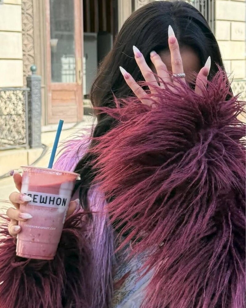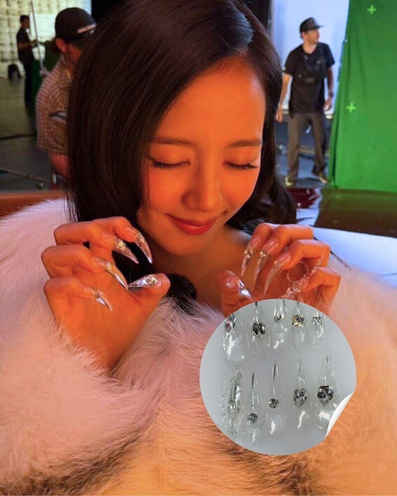 透明凝膠塑形成水滴狀,搭配水晶點綴,閃爍如冰雕! 這款美甲細節超級精緻,在光線下會折射出立體光澤,Jisoo 用它搭配毛絨外套,完美詮釋「冰晶系女神」的華麗優雅。
