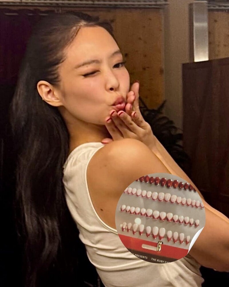 紅白拼接成 V 字形邊線,復古又甜美,讓人聯想到老電影中的紅唇女伶。Jennie 以這款指甲搭配紅唇與眼線造型,呈現性感卻不俗氣的復古氛圍。細節利落,是她常用來「點亮造型」的小心機。