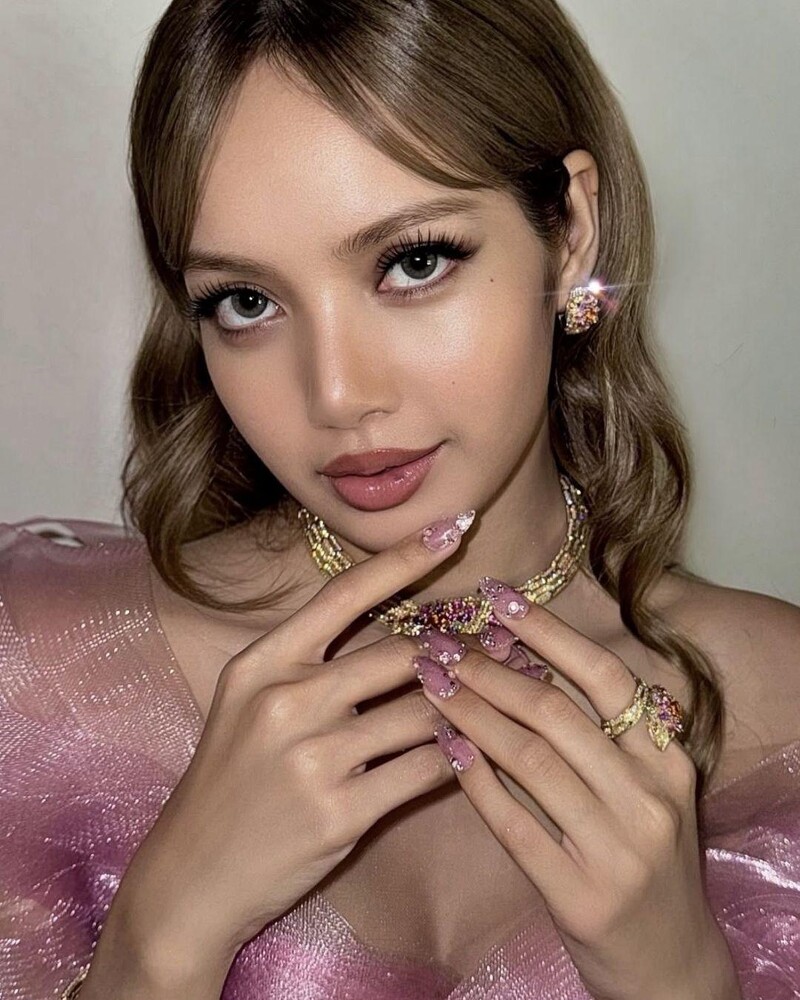 粉透底色加上水晶亮片與碎鑽堆疊,閃爍感就像是糖衣玻璃。這款特別能襯托膚色,讓手看起來更細緻乾淨! LISA 常以它搭配粉紫禮服或高光妝容,整體氛圍甜中帶貴,是派對季節的必備靈感。