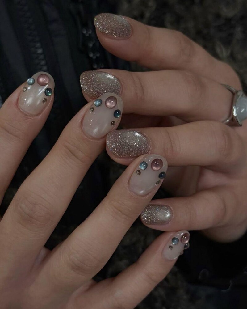 以裸粉色打底,讓整體氣色看起來更柔和,再以大小不一的銀色金屬珠進行點綴。這款美甲排列方式不刻意對稱卻有設計感,讓甲面看起來活潑卻不雜亂。而銀色在這裡成為畫龍點睛的角色,適合想要一點造型感的人。