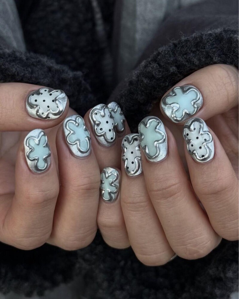 利用銀色描繪出立體邊框線條,中間搭配冷調藍灰、薄荷色系,整體視覺偏向 Y2K 氛圍,這款美甲的銀色不只是裝飾,而是構成整體設計的輪廓核心,線條感非常明確!美甲風格個性鮮明,很適合喜歡設計感、或想讓美甲成為造型亮點的人。